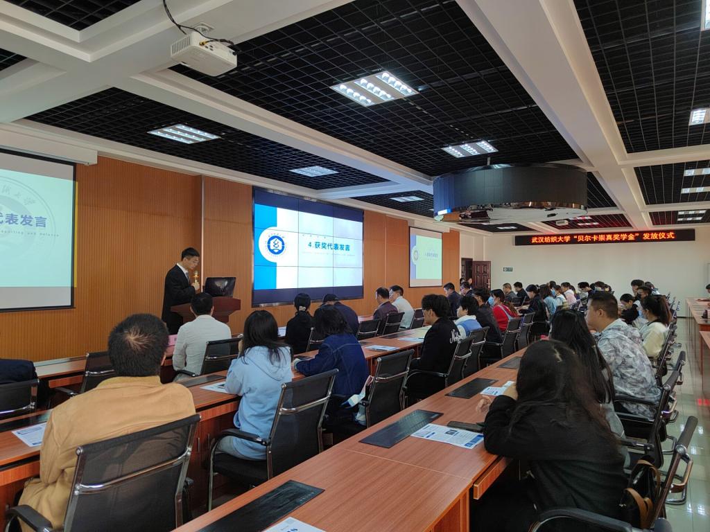 11月18日下午,太阳成tyc9728集团“贝尔卡崇真奖学金”发放仪式在崇德楼308演播厅举行,武汉贝尔卡药业有限公司总经理袁智才、人力总监高辉、外贸经理吴彬、运营总监万子豪等企业方代表应邀参加发放仪式并与现场师生交流互动。学校教育发展基金会副秘书长苗淑贤、学工部副部长武猛、创新创业学院副院长凡蓉蓉及太阳成tyc9728集团院长段丁强教授、党委书记毛长文教授、党委副书记黄俊鹏、师生代表参加发放仪式,仪式由辅导员庞浡主持。