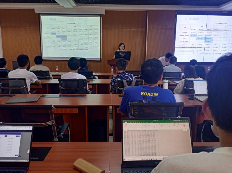 最后由刘港同学进行汇报,就《科技与金融结合试点政策促进了经济增长吗——基于双重差分的研究》进行汇报。由李俊霖博士进行点评,其他同学进行提问。