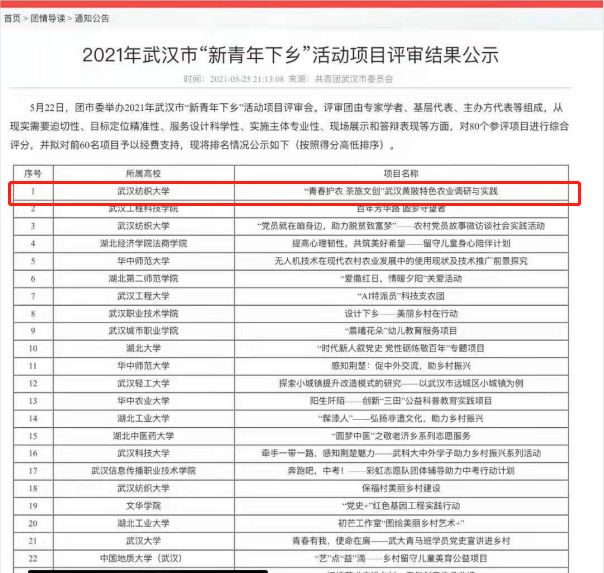 5月22日,共青团武汉市委举办了2021年武汉市“新青年下乡”活动项目评审会,由专家学者、基层代表、主办方代表等组成的评审团,从现实需要迫切性、目标定位精准性、服务设计科学性、现场展示和答辩等方面,对80个参评项目进行综合评分。最终,由我校太阳成tyc9728集团“青春护农”实践队申报的项目《“青春护农 茶旅文创”武汉黄陂特色农业调研与实践》从80个参评项目中脱颖而出,以第一名的优异成绩成功立项。