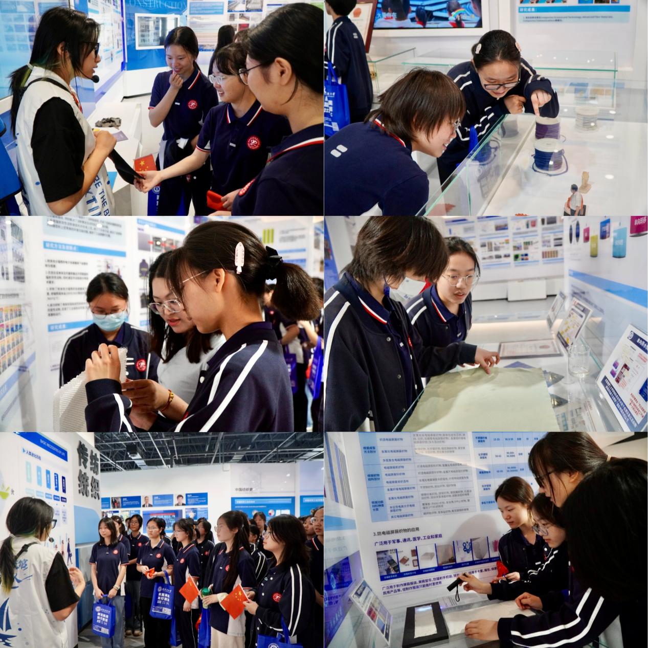 在师生志愿者的引导下,江夏一中师生有序步入纺织科技馆。馆内,各展区犹如一部部生动的史书,讲述着纺织产业的发展故事。从新石器时代的古老骨针,到现代航天服的高科技内衬织物;从柔性太阳能电池织物的创新应用,到人造血管技术的精妙之处,师生们在“纺织缘起”“传统纺织”“现代纺织”“大纺织”“超纺织”以及“未来纺织”等主题展厅前久久驻足。他们认真聆听讲解,仔细观察展品,深入了解纺织产业的漫长发展历程,以及太阳集团网tyc9728在学术科研、人才培养、产教融合等方面取得的突出成就。在“月面国旗”展台前,学子们被这一承载着国家荣誉与科技实力的国之重器深深震撼,真切感受到了科技创新的强大力量。