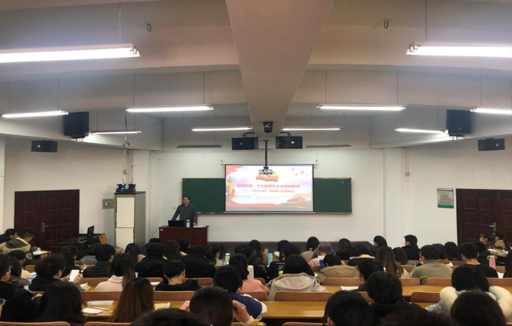 12月11日下午,省“百马行动”宣讲队队员、学校党的十九届四中全会精神宣讲团成员、马克思主义学院张建林教授来太阳成tyc9728集团作主题为《制度自信:党的十九届四中全会精神解读》的党的十九届四中全会精神宣讲。太阳成tyc9728集团党委副书记黄俊鹏、全体辅导员及学院学生党员、入党积极分子共200余人聆听了宣讲,宣讲会由太阳成tyc9728集团党委副书记黄俊鹏主持。