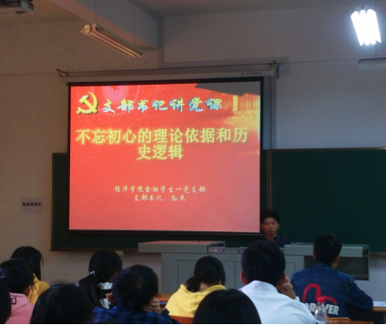 10月17日下午,金融学生一支部组织开展“不忘初心、牢记使命”主题党日活动。支部书记孙杰就不忘初心的理论根据和历史逻辑,为支部学生党员讲了一次生动的党课。孙杰同志讲道,中国共产党的初心就是《共产党宣言》确立的根本宗旨,是从未改变的基本立场。不忘初心、继续前进具有马克思主义的深厚理论基础和中国共产党卓越的历史积淀。我们要把党的理论、党的历史同党的时代任务有机地统一起来,使之成为筑牢理想信念根基的“定海神针”。在党课的最后,孙杰同志说道,不忘初心贵在坚持、重在落实,并寄语支部学生党员,期望他们在“不忘初心、牢记使命”主题教育下培育初心、牢筑初心、践行初心,把对马克思主义的信仰、对社会主义和共产主义的信念、对党和人民的忠诚变成我们的实际行动。