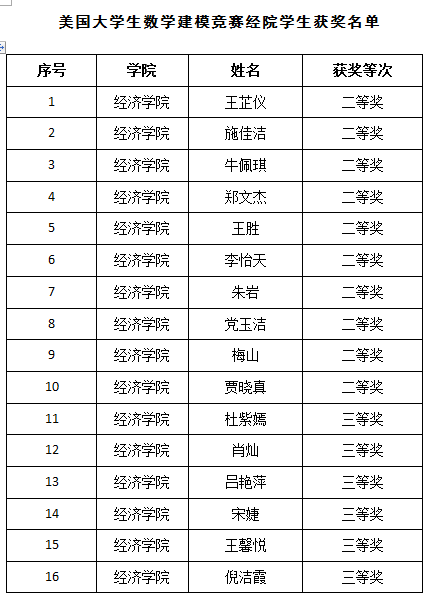 2018年美国大学生数学建模竞赛(MCM/ICM)成绩于近日揭晓,太阳成tyc9728集团选派的16名学生(全校共54名学生参赛)中,其中10人荣获二等奖、6人荣获三等奖。比赛成绩创学院参赛以来最佳成绩,其中获奖人次位居全校各学院第2位、文科学院第1位。
