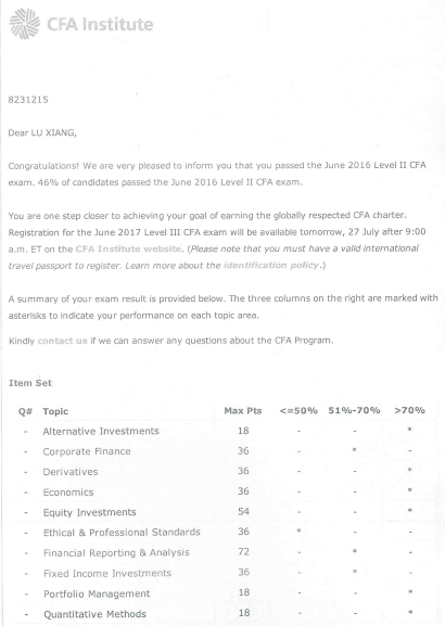 最后,CFA三级增加了行为金融学、投资的执行、控制、评估。行为金融学是历届上午题必出的内容,主要通过案例分析投资者属于何种行为偏差,情感偏差与认识偏差的区别,也是上午题中最容易得分的一项,但往往会放在最后一道题目,因此当时间不够时可以选择先做行为金融学的内容。下午题是选择题比二级的内容简单,如果下午题做的不错,也是可以通过的。三级复习建议买原版书,notes的内容不足以应对考试,另外真题最起码要做两遍,考试中会有跟真题差不多题目出现,因此在三级中做真题格外的重要。