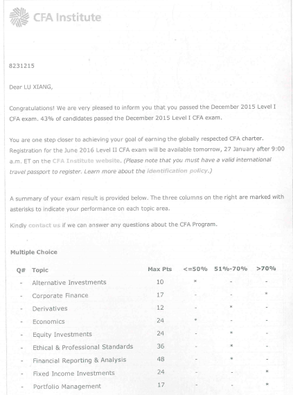 2018年8月底,CFA协会公布了2018年6月CFA三级考试成绩。我院2015届毕业生项露顺利通过考试,距离成为CFA持证人更近了一步。