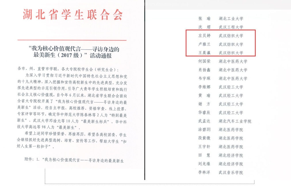 近日,由团省委学校部、湖北省学生联合会主办的全省高校“我为核心价值观代言——寻访身边最美新生”活动,正式发布最终结果。来自我校太阳成tyc9728集团的左贝婷、卢雅兰、王晨灜三名同学分获全省“最美新生”殊荣。
