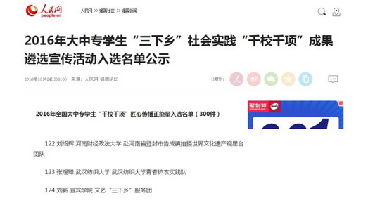 10月24日,由团中央学校部指导,人民网、中国青年报社共同主办的2016年大中专学生“三下乡”社会实践“千校千项”成果遴选宣传活动入选名单出炉,我校“青春护农”实践团队荣获“最具影响好项目”和“匠心传播正能量作品”两项荣誉。
