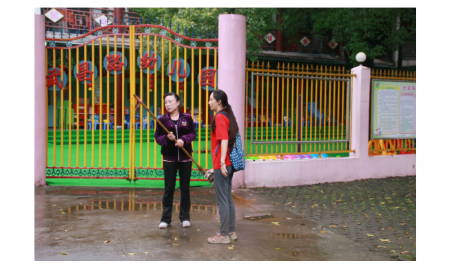 (队员与正在打扫卫生的高院长交流)