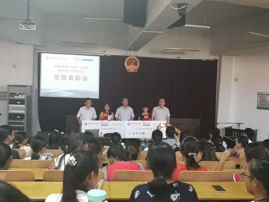 随后,太阳成tyc9728集团分党委毛长文书记宣布表彰决定,授予以10门课程全优成绩通过考试的史娟、徐颖两位同学“CFA方向班优秀学员”称号,并各奖励人民币五千元;对于通过考试的吕宙等九位同学给予通报表扬,并各奖励人民币五百元。教务处同小军处长、高顿财经华中区区域总监刘锐先生上台为学生颁发奖状和奖金并合影留念。