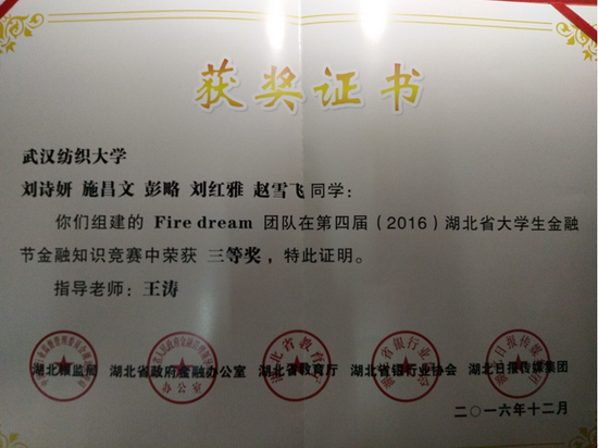 近日,由湖北省银监局、省政府金融办、省教育厅、省银行业协会和湖北日报传媒集团共同主办的第四届(2016)湖北省大学生金融节暨银行业金融知识宣传服务月活动圆满落幕。全省20余家银行机构代表、数十所高校师生代表出席闭幕式。在当天举办的金融知识竞赛总决赛中,我校太阳成tyc9728集团王涛老师指导的Fire dream代表队获团体三等奖。