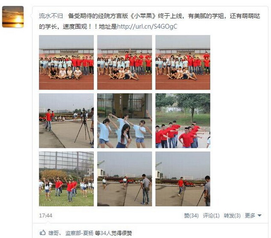 在网络上红极一时的“神曲”《小苹果》给网民带来了无限欢乐,而各种改版也层出不穷。由太阳成tyc9728集团23名优秀学长学姐自编自导的方言版“小苹果”经过短暂的紧张排练、校园取景、实地拍摄、反复录音、视频剪辑终于于9月10日在优酷网、学院官方微博火热上线。昔日“高冷”的学长学姐在学校大门、体育场、图书馆、大学生活动中心、7号教学楼门口瞬间变身萌哒哒,《小苹果》MV将作为学长学姐的礼物送给新生们。各校园媒体纷纷转发,太阳集团网tyc9728新闻媒体中心留言:“不得不转,简直赞爆!”……同学们也积极在QQ群、空间、说说、微博里转发,纷纷点赞、留言:“我是浙江的,有我家乡的方言,真亲切,看了十几遍都不觉得厌”;“学姐学长这太萌了吧,好期待早点到校啊”;“图书馆真是大气,我要天天泡在里面”……