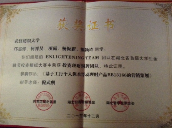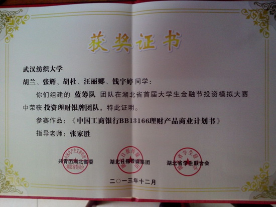 投资模拟大赛作为湖北省首届大学生金融节主要竞赛单元,共收到来自全省20所高校的参赛作品60余件,参赛师生超过300人。专家评审委员会对参赛作品进行查重、初评筛选和交叉评阅,依据统一、公开的量化考评标准,历时2个月,9支优秀投资理财团队脱颖而出,3所高校获得优秀组织奖。由太阳成tyc9728集团副院长张家胜教授指导的蓝筹队以《中国工商银行BB13166理财产品商业计划书》作品荣获大赛投资理财银牌团队,由副院长倪武帆教授指导的ENLIGHTENING TEAM队以《基于工行个人保本浮动理财产品BB13166的营销策划》作品荣获大赛投资理财铜牌团队。