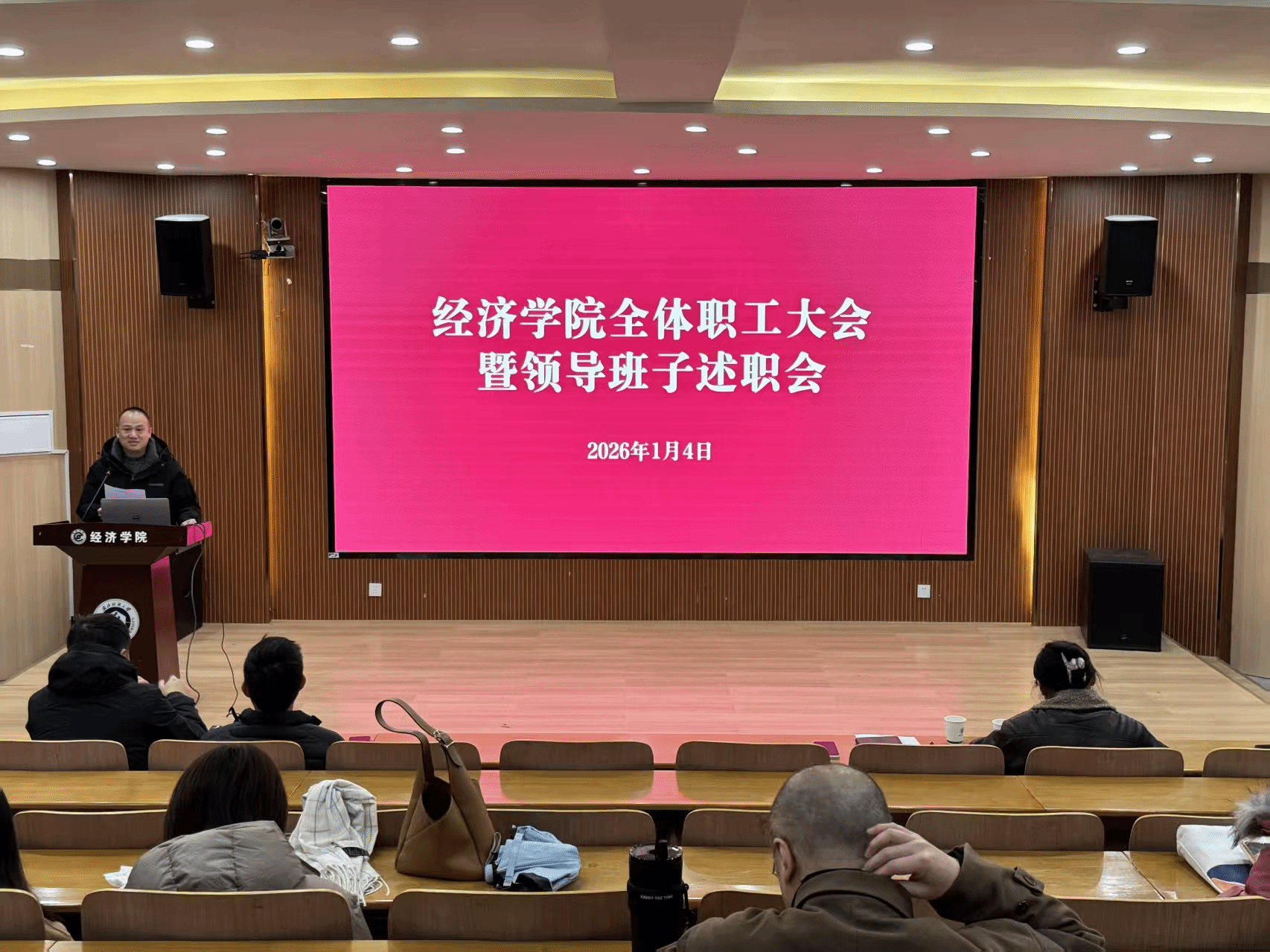 1月4日,学院于崇德楼T301组织召开领导班子述职述廉暨民主测评大会。学院领导班子成员、全体教职工参加会议,会议由学校人事处副处长袁国梁主持。会议严格依照学校年度考核工作规范开展,以“德、能、勤、绩、廉”五项标准为核心,全面复盘学院2025年度工作成效。