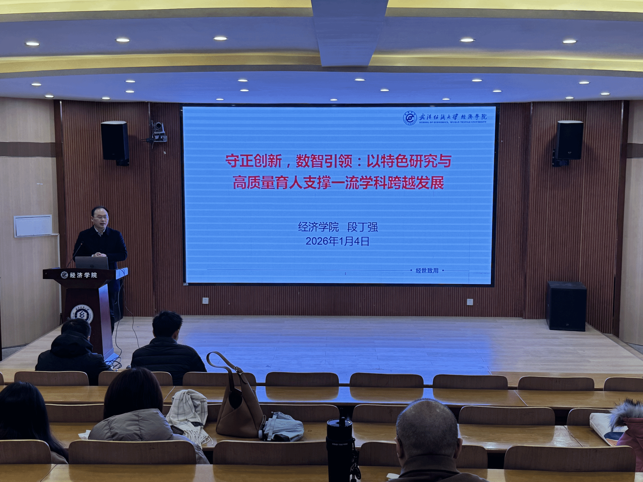 院长段丁强以“守正创新,数智引领:以特色研究与高质量育人支撑一流学科跨越发展”为题做述职报告。他全面总结了学院在学科建设、本科教学、研究生教育与国际合作、科研工作、师资队伍建设、学生升学就业与创新实践、财务资产等方面取得了发展成果与进展,客观剖析了当前学科专业数字化转型力度不足、高层次人才引育未实现突破等问题,明确提出2026年推动一流学科跨越发展的工作重点、核心目标与具体实施举措。