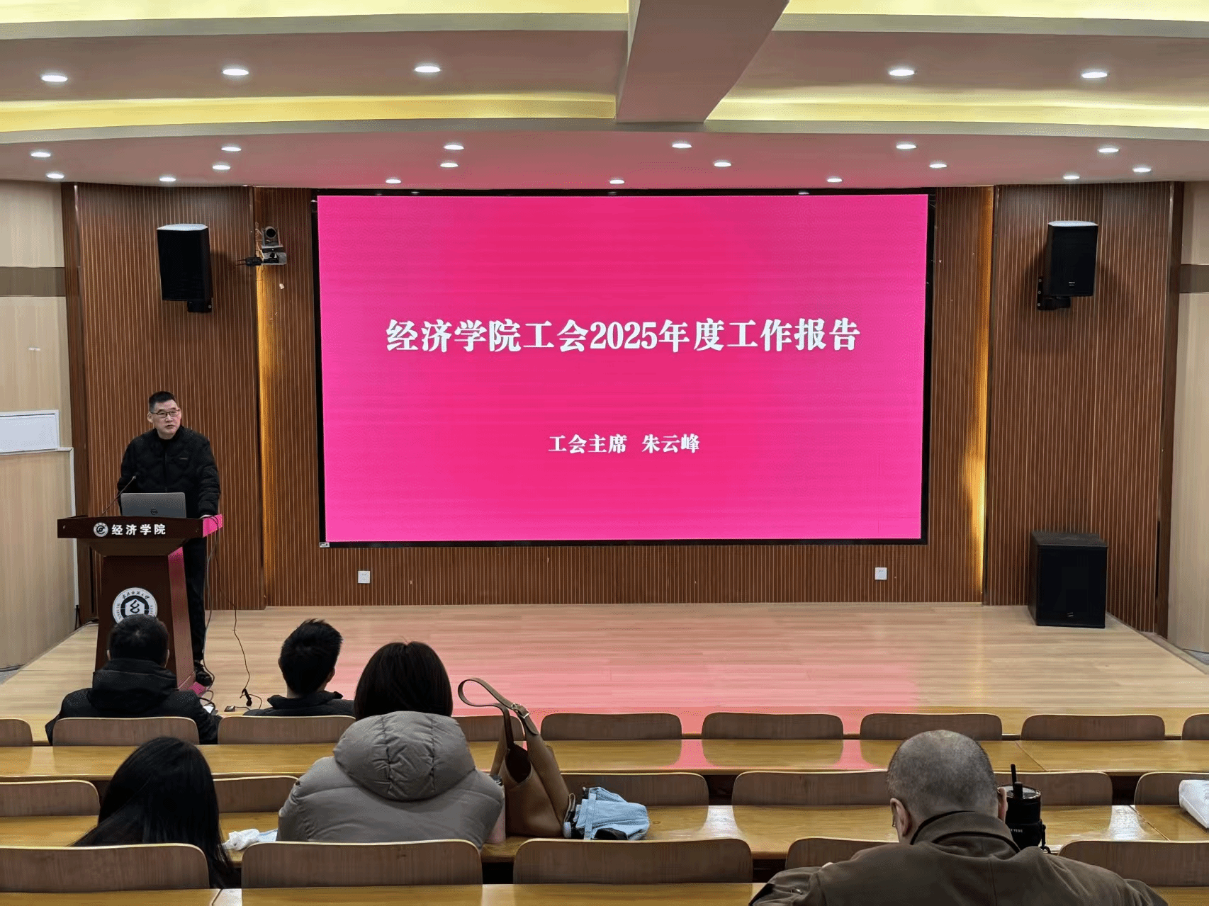 随后,学院工会主席朱云峰主持召开太阳成tyc9728集团教职工代表大会,全面汇报2025年度工会工作,系统梳理了工会在服务教职工、丰富校园文化生活、维护教职工权益等方面的工作成效,并广泛听取了教职工的意见与建议。