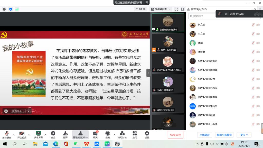 报告会以《见证山乡巨变:“以小见大”共话美丽乡村新图景》为主题,青年宣讲团柯文殊、张佳琪、彭诗瑶、柳佳钰、向淼等5名团员围绕“‘小景’与‘大图’:由党代会报告看乡村振兴”“‘小家’与‘大国’:从山乡巨变话时代变迁”“‘小我’与‘大我’:以‘青春之我’谱‘振兴之歌’”等三个维度,结合党的二十大报告、湖北省第十二次党代会报告及个人成长生活与实践观察经历,用通俗易懂的语言,系统介绍了党代会的背景、主题与意义,准确讲解了党代会报告的丰富内涵与核心要义,生动讲述了在党的领导下“小产业”带动“大蝶变”、“小切口”展现“大文明”、“小乡村”焕发“大生机”等乡村巨变的鲜活案例。她们以黄文秀、学校“西部计划”志愿者等青年榜样为例,勉励大家要深入学习党的二十大精神,做起而行之的行动者、当攻坚克难的奋斗者,充分发挥青春才智,以永不懈怠的精神状态和一往无前的奋斗姿态,参与到中国式现代化进程中,投身“美好纺大”建设实践中,共谱绚丽青春之歌。