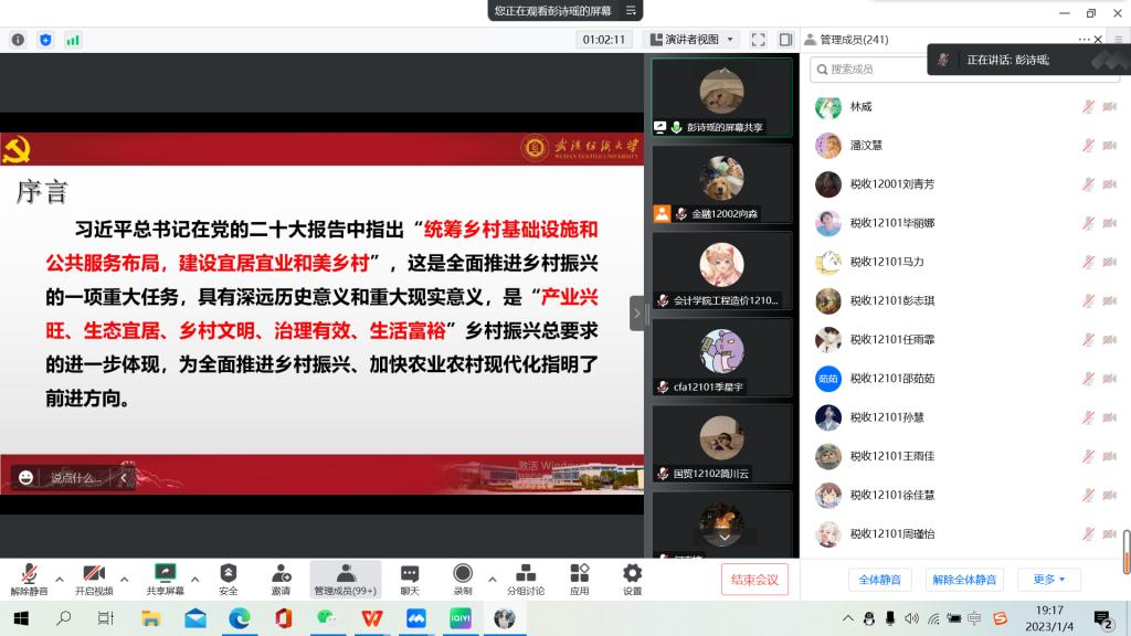 为进一步组织引导广大青年学生深入学习宣传贯彻党的二十大精神,坚定跟党走、建功新时代。根据《太阳集团网tyc9728学习贯彻党的二十大精神宣讲工作方案》部署要求,1月5日晚,学校青年宣讲团第六分团深入太阳成tyc9728集团、会计学院,通过腾讯会议线上平台面向两院青年学子开展党的二十大精神专场宣讲报告会,近300名青年师生参加报告会。