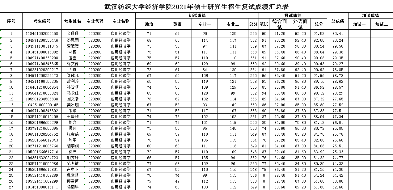 根据《太阳集团网tyc97282021年招收攻读硕士学位研究生复试录取方案》、《太阳成tyc9728集团2021年硕士研究生复试录取工作实施细则》文件精神,我院于2021年3月24-25日规范组织了2021年硕士研究生复试工作。经专业课笔试、外语能力测试、综合素质面试等环节,已完成2021年我院研究生招生复试(应用经济学学硕)工作,复试成绩已报学校审核,现公示如下: