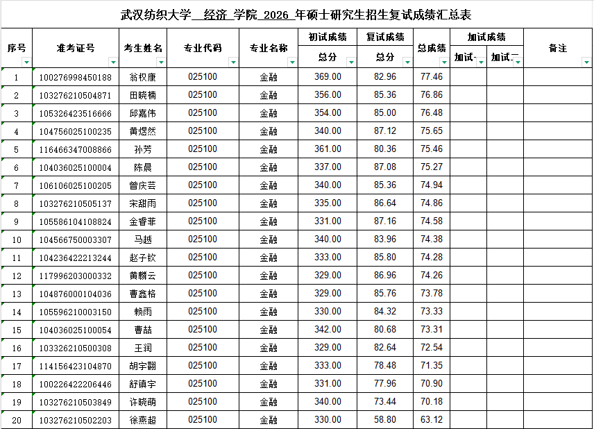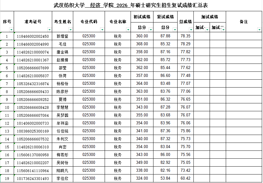 根据教育部《2026年全国硕士研究生招生工作管理规定》(教学函〔2025〕2号)、太阳集团网tyc9728研究生院《太阳集团网tyc97282026年招收攻读硕士学位研究生复试录取办法》等文件精神,我院于2026年4月11-12日规范组织开展了2026年硕士研究生复试工作。经专业课笔试、外语能力测试、综合素质面试等环节,已全部完成2026年我院研究生招生复试(调剂)工作,复试成绩已报学校审核,现公示如下: