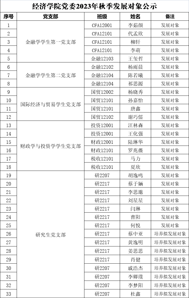 根据《中国共产党章程》和《中国共产党发展党员工作细则》规定,经各班团支部推荐、综合考评考察、各党支部审议、学院党委审查决定,将以下33名同志列为发展对象,现予以公示: