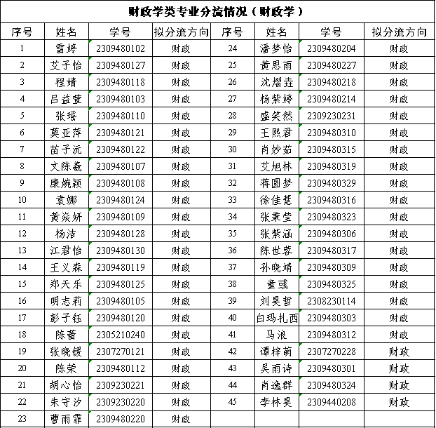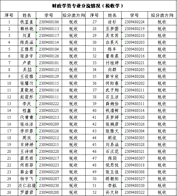 按照专业分流方案,2023级财政学类专业分为财政学和税收学两个方向,经学生自愿报名,雷婷等45人进入财政学方向,钱蓝星等52人进入税收学方向,详细名单如下: