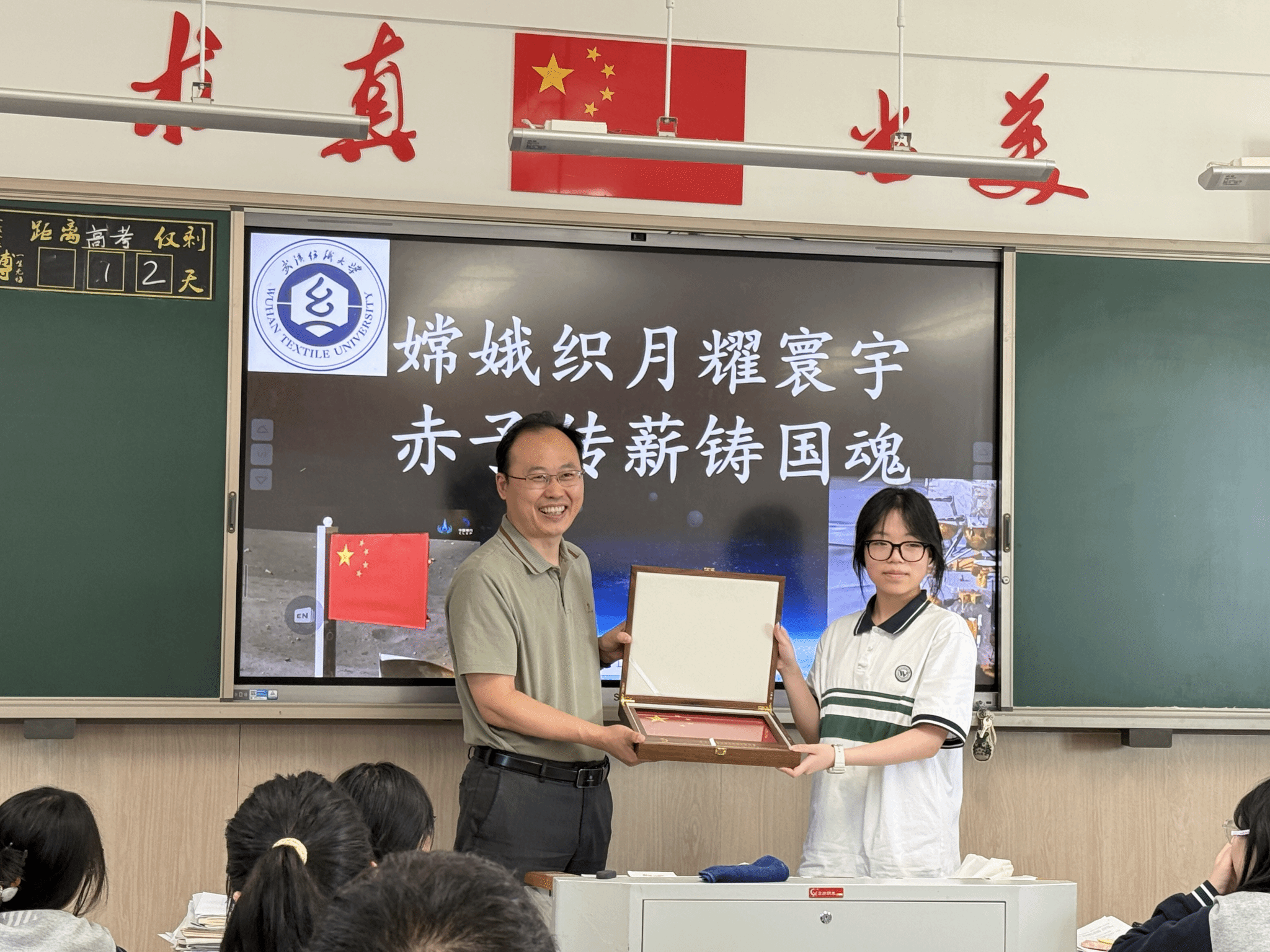 6月28日,刘园美走进老师和学生中,以《黄鹤楼下人文韵千年流淌 纺大园中月国旗九天飘扬》为题为该校师生带来了一堂生动的跨学科人文讲座。讲座中,刘园美生动讲解历史悠久的黄鹤楼的人文韵味,也讲述了纺大月面国旗的历史意义、科技背景、研发历程,还和该校学生们进行了互动交流。