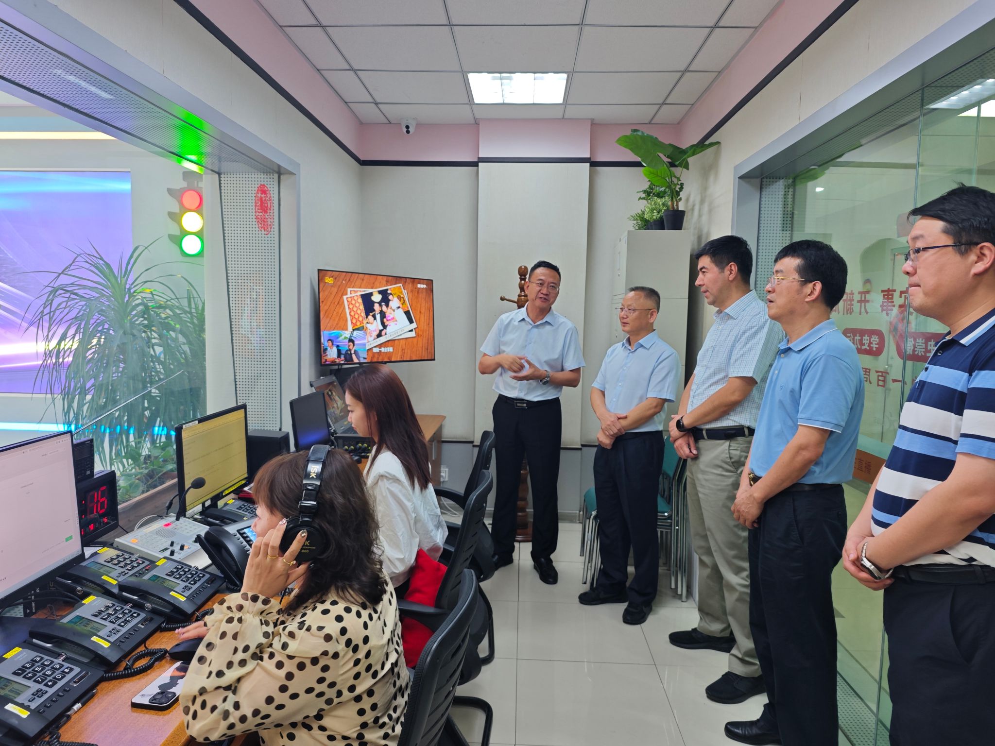 在新疆广播电视台,罗锦银亲切看望慰问2005级广播电视学专业校友张紫嫣,受到台委委员、副台长安尼瓦尔·卡地尔的热情迎接。在安尼瓦尔·卡地尔副台长和人事处处长焦晓军的陪同下,先后调研了媒体融合发展中心、949广播直播室、961广播直播室、电视新闻中心、4K新闻演播室和4K新闻制作网,双方就宣传工作机制建设、传媒人才培养、媒体融合发展等进行了深入交流。