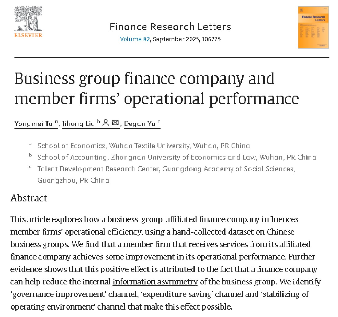 近日,太阳成tyc9728集团涂咏梅教授合作完成的学术论文“Business Group Finance Company and Member Firms’ Operational Performance”在国际知名期刊Finance Research Letters在线发表。论文第一作者为涂咏梅教授,太阳集团网tyc9728为第一作者单位。