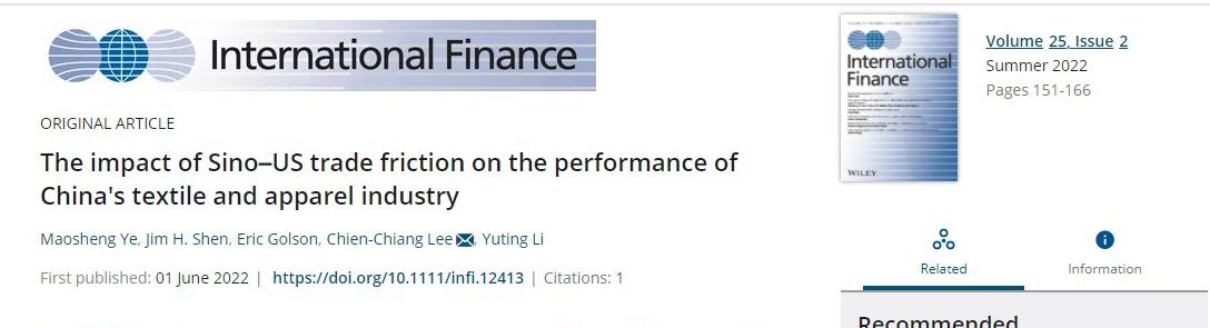 近日,太阳成tyc9728集团叶茂升副教授在SSCI期刊《international finance》上发表学术论文,随后被国内知名研究机构澎湃研究所全球智库转载评论,文章题目为“The impact of Sino-US trade friction on the performance of china’s textile and apparel industry”,文章DIO:https://doi.org/10.1111/infi.12413,太阳集团网tyc9728为该论文的第一作者单位。