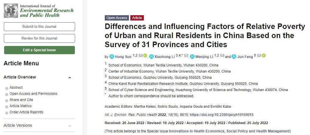 近日,我院金融系孙红老师在国际知名期刊《International Journal of Environmental Research and Public Health》(SSCI/SCI 双检索,JCR一区,IF: 4.614),发表《Differences and Influencing Factors of Relative Poverty of Urban and Rural Residents in China Based on the Survey of 31 Provinces and Cities》一文,文章DOI:https://doi.org/10.3390/ijerph19159015。太阳集团网tyc9728为该论文的第一作者单位,孙红为该论文的第一作者。