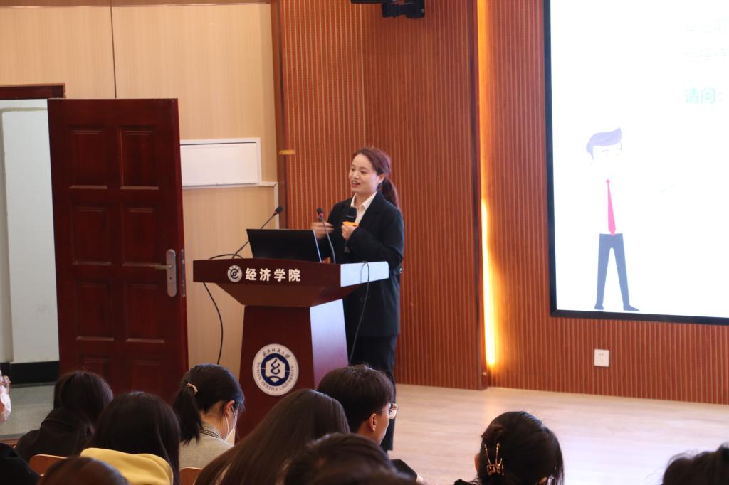 史双双以《商务礼仪》为主题作分享交流,系统讲解了“什么是商务礼仪”“商务礼仪的重要性”“职业形象打造”等方面的知识内容。她结合日常工作生活中的典型事例,对语言、微笑、站姿、走姿等服务接待礼仪进行了讲解。针对同学们感兴趣的问题,进行了现场互动展示,在寓教于乐中讲授了商务礼仪的基本原则、规范与禁忌,强调礼仪关乎形象塑造、高效沟通与职业发展,传授了会面礼仪、社交空间距离、电话礼仪及职场服饰礼仪等细节知识,并为大家推荐了一些与职场礼仪相关的书籍。