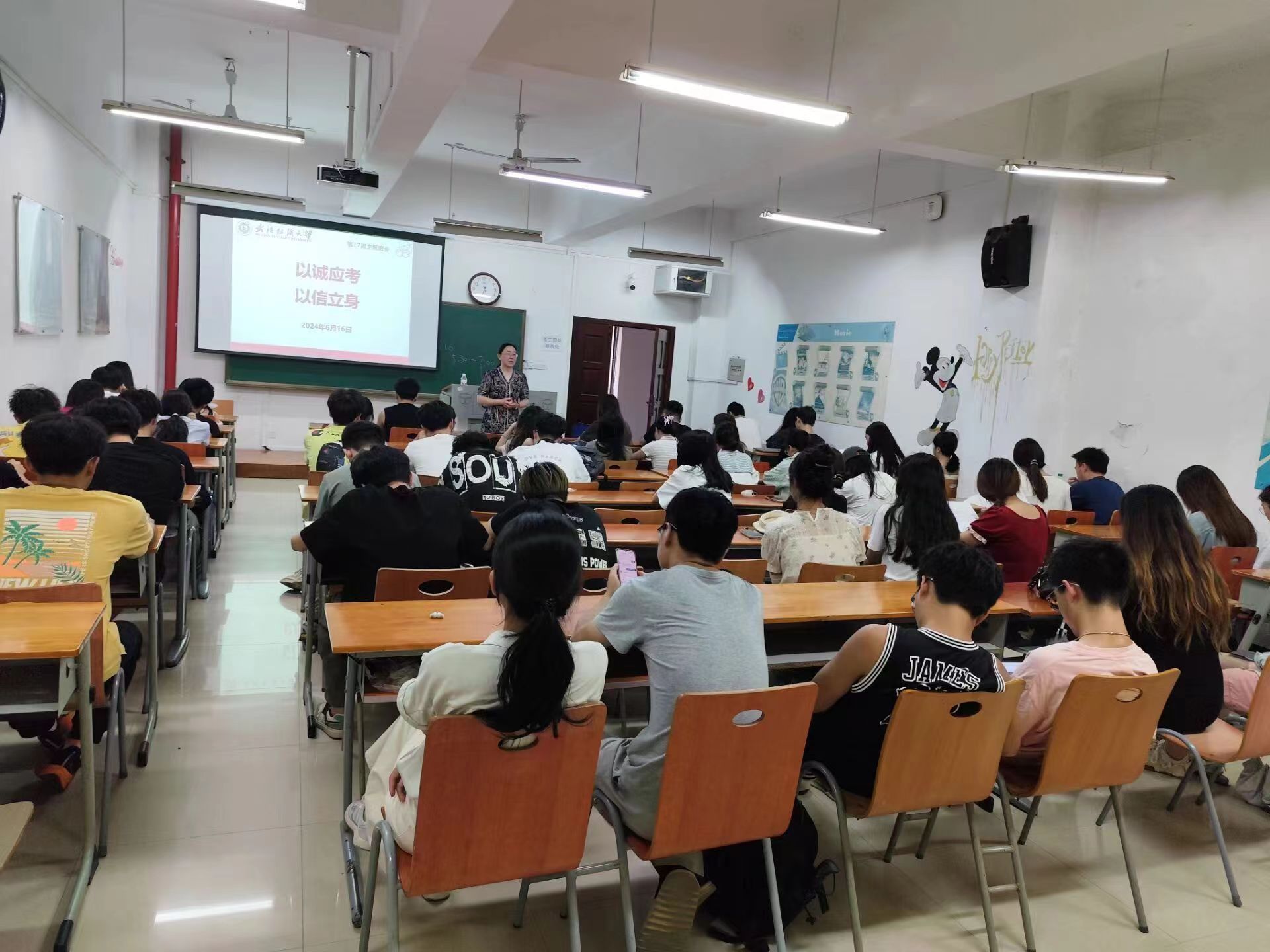 6月16日晚,学院全体辅导员、班主任以年级大会和主题班会的形式组织召开晚点名,深入每个班级,确认每位学生报到情况,掌握了解学生未及时报到详细原因,并开展“以诚应考,以信立身”主题班会。