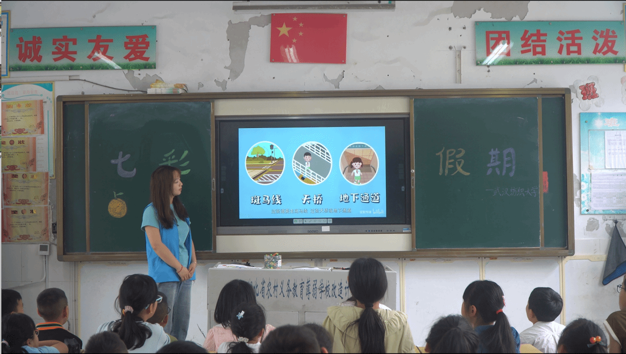 为了让孩子们掌握必要的安全知识,支教队员们精心策划了一系列实践活动。在防溺水安全教育课上,支教队员余爱婷扮演成一位不慎落水者,向孩子们求救:“我溺水了,快救救我呀!”面对这种紧急情况,三年级的杨鑫宇小朋友展现了课堂上所学,他没有贸然跳水救人,而是冷静地评估了自己的救援能力,选择了大声呼救并寻找成人帮助,体现了正确的应对方式。而在交通安全教育的环节中,孩子们齐声高唱《交通安全歌》:“交通法,要记住,过路口,别乱闯……”朗朗上口的旋律,清晰明了的指令帮助孩子们快速掌握交通安全的要点。支教队员杨熙通过图像匹配教学,让孩子们判断图片中小朋友的行为是否正确,以此判断孩子们的掌握程度。同时他还强调了遵守交通规则的重要性,呼吁孩子们在出行时有意识的保护好自己。