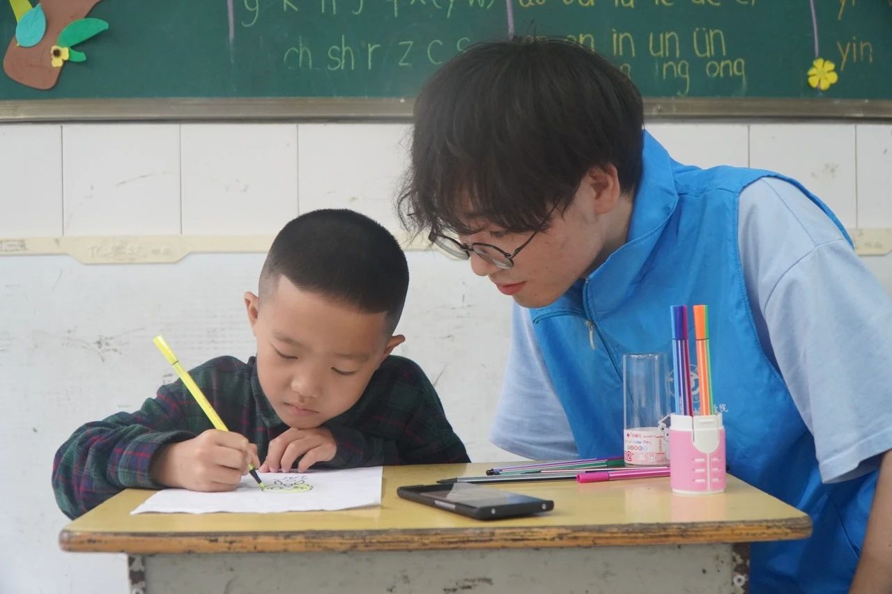 支教队员杨天赐在课堂中的时候发现黄宏扬小朋友在心愿便利贴上写下了“我想为妈妈画一幅画”的愿望,但是却一直犹豫,无法动笔。杨天赐耐心地询问小朋友想要如何绘画,黄宏扬想了片刻,娓娓道来,他描述着妈妈的眼睛,像星尘一样明亮,讲述着妈妈的笑容,仿佛可以融化冬日的寒冷,杨天赐手中笔尖轻触纸面,随着孩子的叙述勾勒出一副初步的轮廓,黄宏扬的小手也不知不觉模仿起杨老师的动作,开始尝试着添加细节,最终孩子的愿望成功达成,他们共绘了一张小朋友心中母亲的画像。