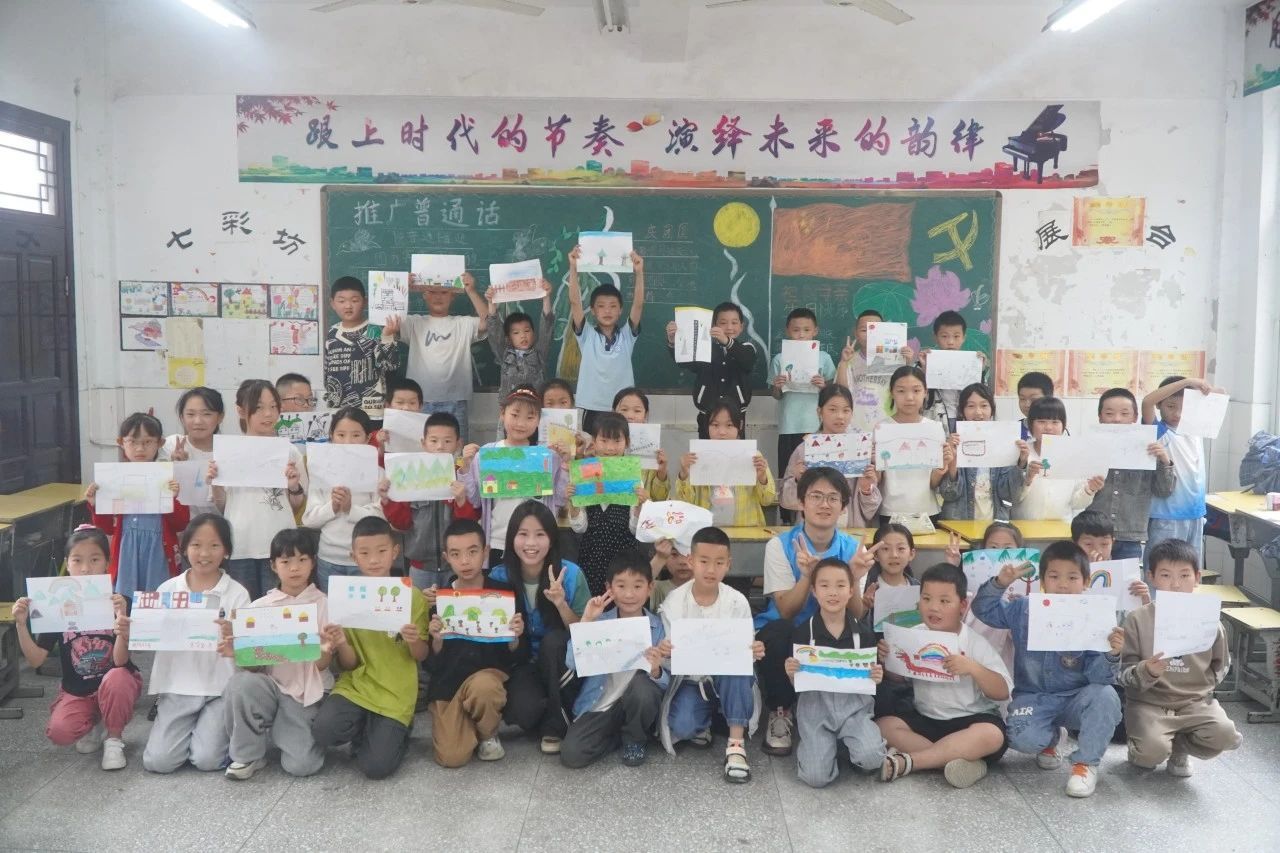 从家乡到祖国,从纸笔到心中,通过“复兴红”课程,孩子们的心中种下了一颗对红色文化的种子。在“画画我的家乡”活动中,孩子们用铅笔描绘出各自心中的家乡景象;一幅幅画作拼凑起他们眼中那多彩的祖国。在支教队员的鼓舞下,学生们踊跃上台,分享自己的家乡画面,将无数小家汇聚成了我们共同的大国。