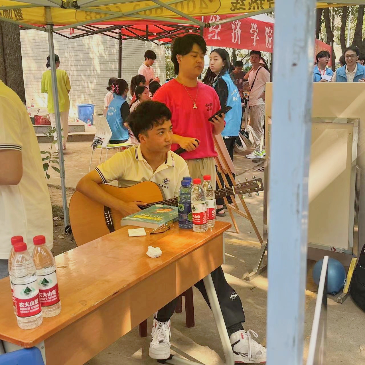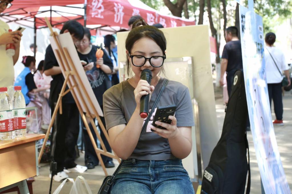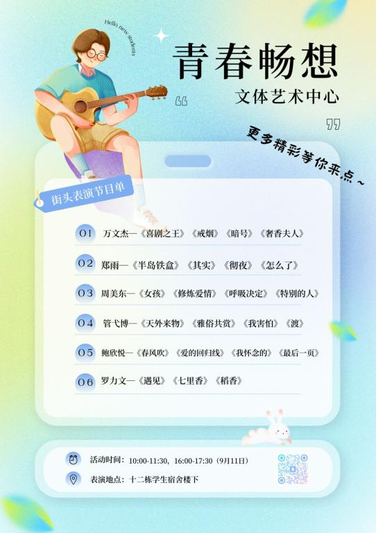 从《奢香夫人》到《稻香》,从细腻的歌曲情感演绎到大气恢弘的意志传递,六位表演者带来精彩纷呈的歌曲表演,引得新生纷纷驻足观看。学长学姐们在街头自弹自唱,现场气氛热闹活跃,与新生互动十分愉快融洽。