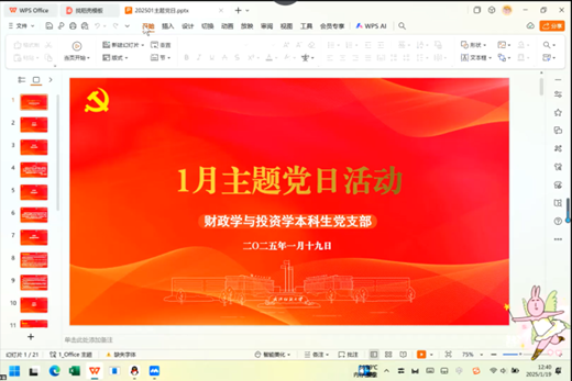 为健全以学铸魂、以学增智、以学正风、以学促干的长效机制,坚持学用结合,深入领会党的二十届三中全会精神,认真学习习近平总书记重要讲话精神,强化学生党员党性修养和党性淬炼,1月19日至27日,学院各党支部于线上组织召开了1月份主题党日活动。太阳成tyc9728集团教工党支部、学生党支部全体党员参加会议,各党支部书记主持会议。